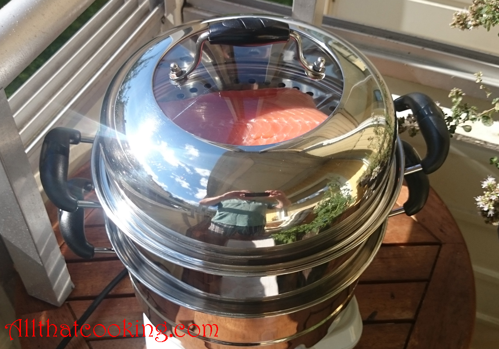 - Oli next added the flat steamer insert, placed the salmon on it and covered his smoking tower it with the lid.